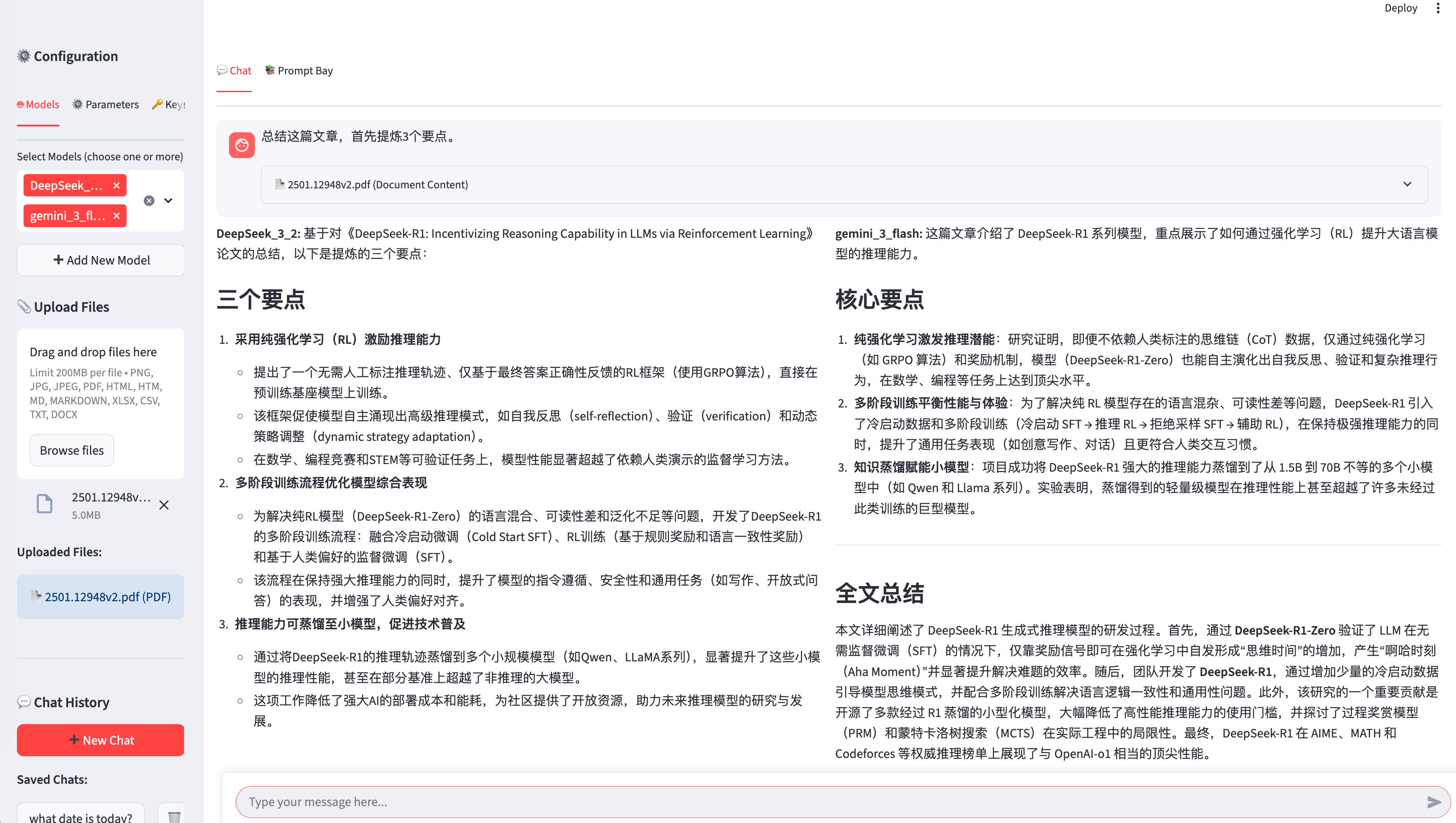 - ๐ค Multi-Model Chat: Query multiple AI models simultaneously with a side-by-side comparison view.