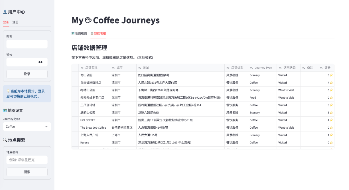 A robust and elegant personal shop management system. Whether you’re tracking your favorite coffee shops, scenic spots, or planning future visits, this application provides a powerful platform for visualization and data management.