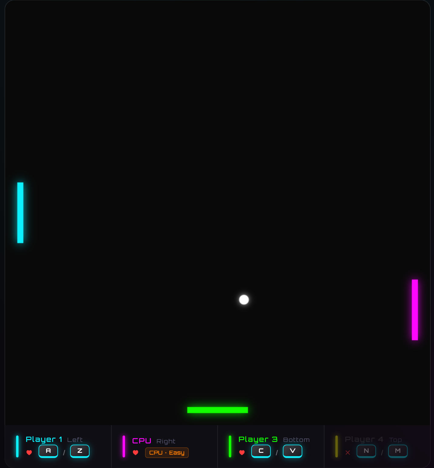 The VibePong game is a simple yet engaging pong-style game where players can compete against each other up to 4 players or against a CPU opponent. The game features various metrics such as ball speed, game duration, and player performance, which are recorded in CSV files for analysis.