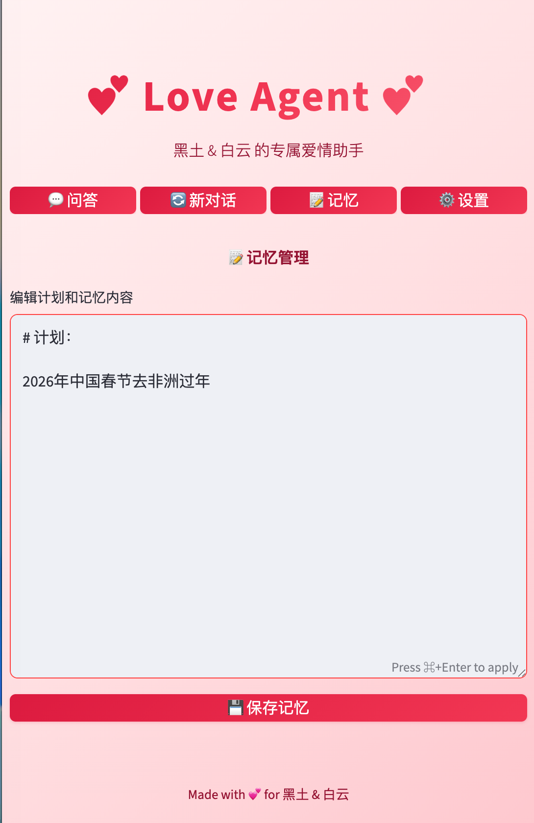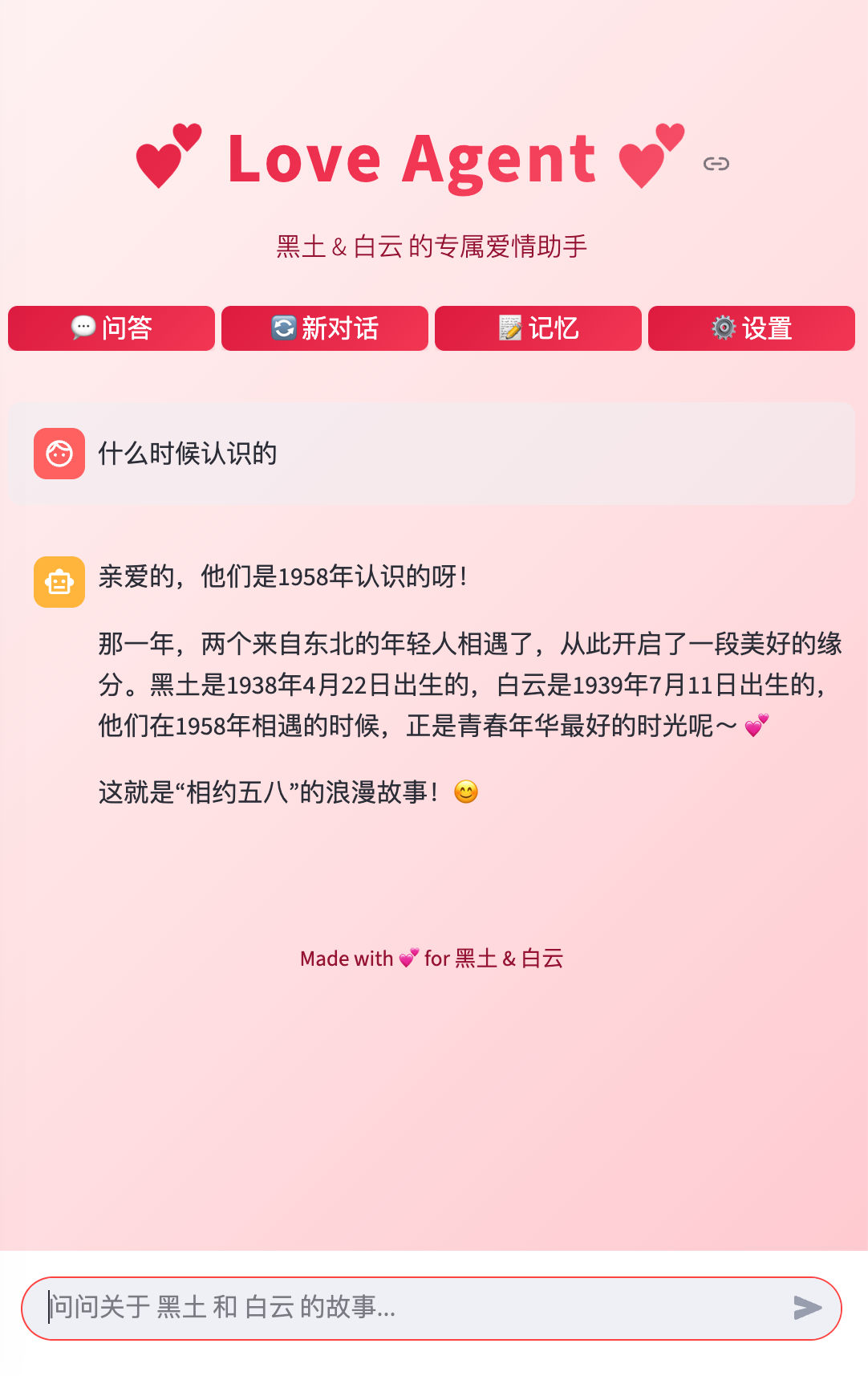 给你心爱的人一个独特的礼物——一个个性化的 AI Agent,用来记录你们的爱情故事。