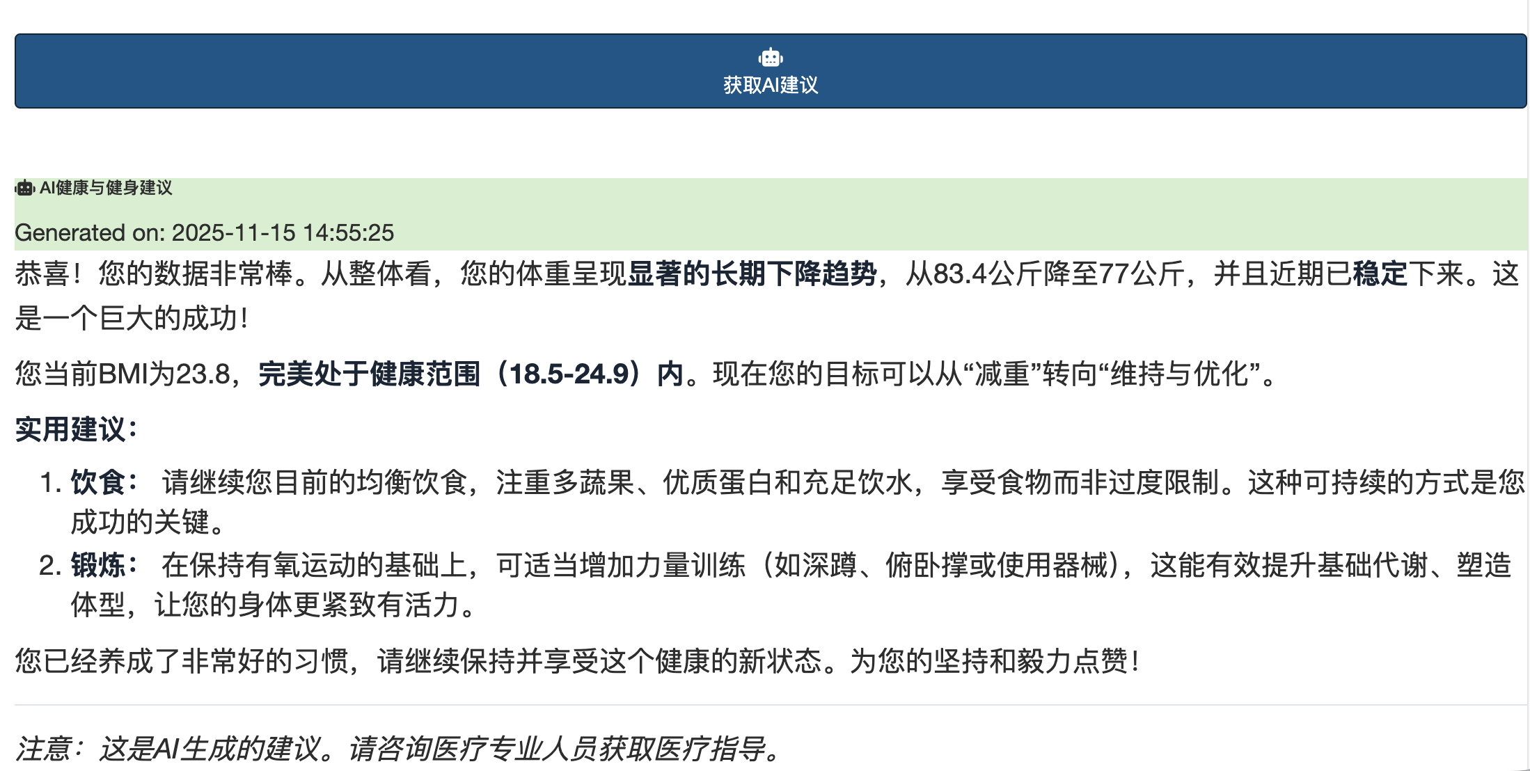 这款体重追踪应用展示了将 R Shiny 的响应式编程与现代 AI 技术相结合的强大力量。项目展示了: