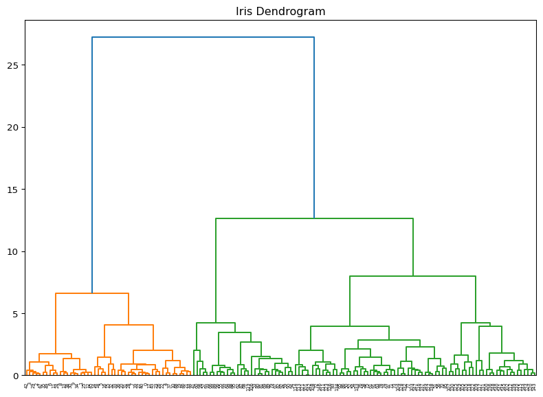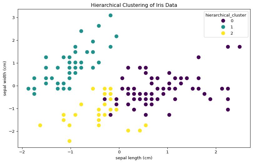 import scipy.cluster.hierarchy as shcplt.figure(figsize=(10, 7))plt.title("Iris Dendrogram")dend = shc.dendrogram(shc.linkage(scaled_iris, method='ward'))plt.show()hierarchical = AgglomerativeClustering(n_clusters=3)iris_df['hierarchical_cluster'] = hierarchical.fit_predict(scaled_iris)# Visualize the clustersplt.figure(figsize=(10, 6))sns.scatterplot(x=scaled_iris[:, 0], y=scaled_iris[:, 1], hue=iris_df['hierarchical_cluster'], palette='viridis', s=100)plt.title('Hierarchical Clustering of Iris Data')plt.xlabel(iris.feature_names[0])plt.ylabel(iris.feature_names[1])plt.show()